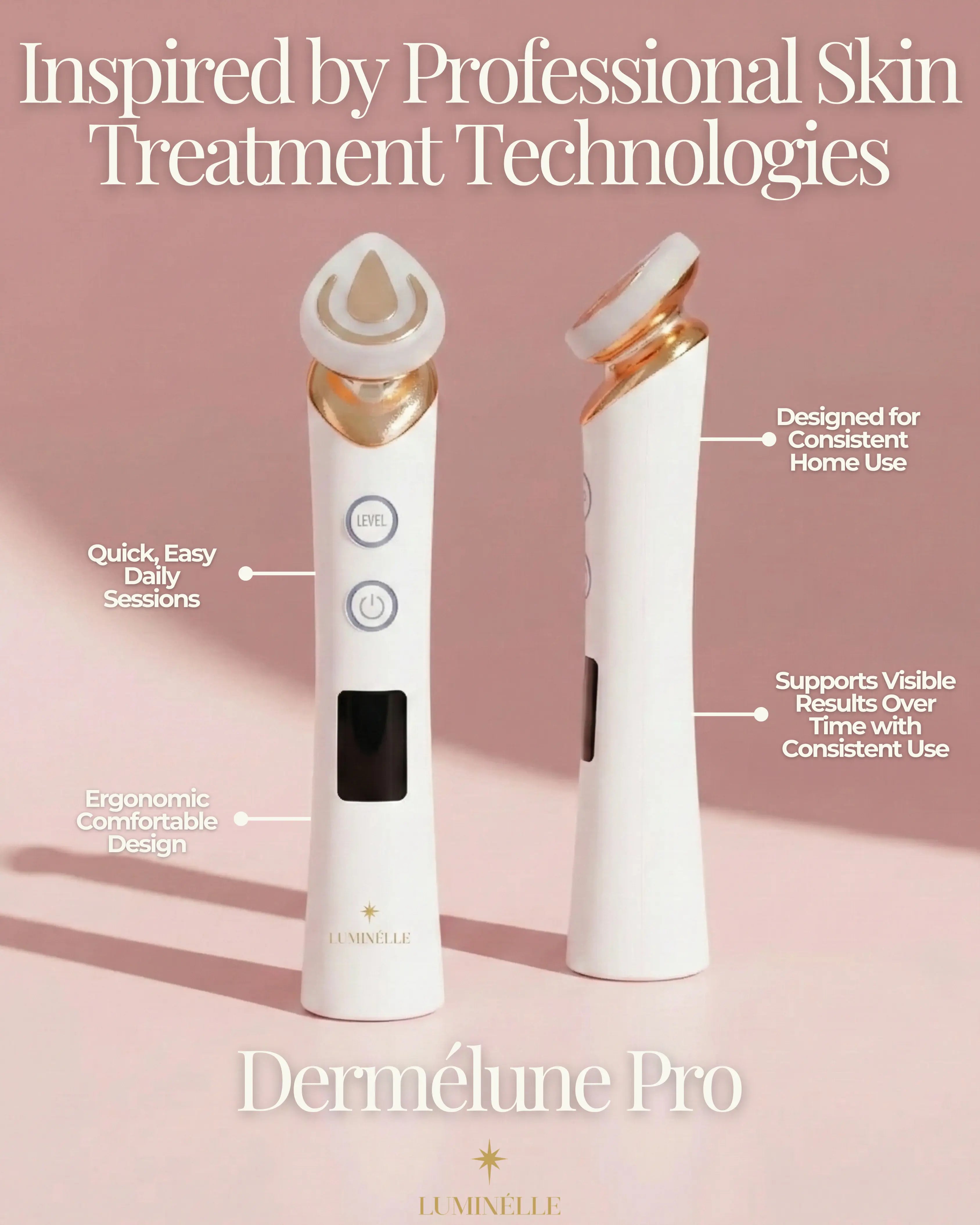 Dermélune Pro is a professional-grade skin device from Luminélle combining LED, EMS, and Electroporation to visibly firm, smooth, and enhance your skin.